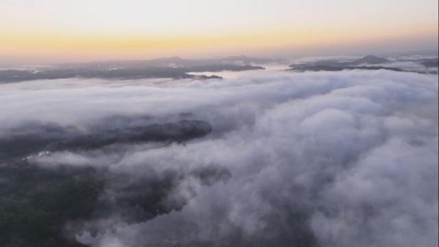 央视网消息 冬日黎明时分,在江西省新余市,仙女湖笼罩在乳白色的晨雾中,远山和树林若隐若现,宛如一幅淡淡的水墨画。此时湖面像深色的绸缎,而雾气则如柔软的棉絮,一团团铺在水上,缓缓随风流动。