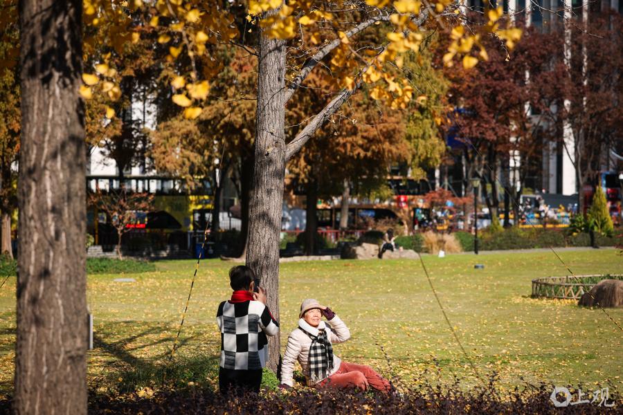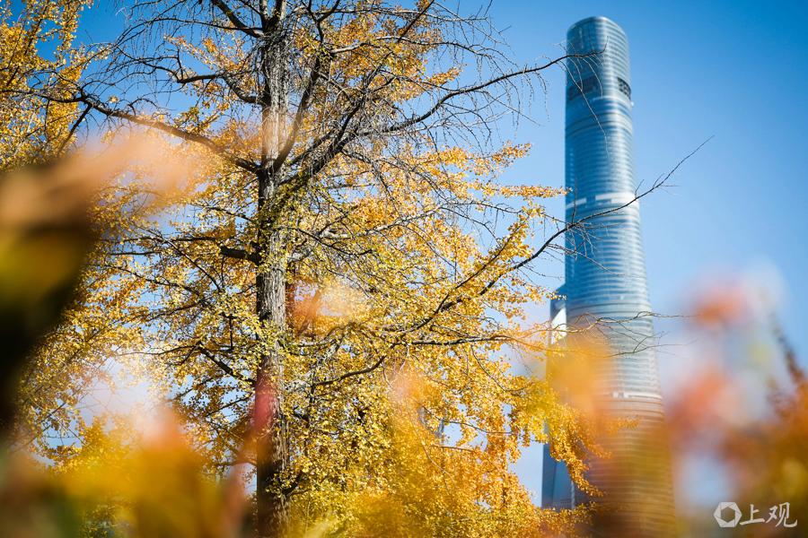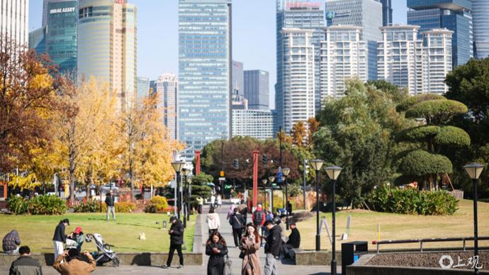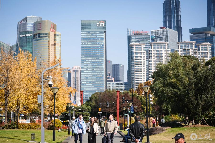 暖阳倾洒,与陆家嘴天际线相映,行人漫步其间,尽享申城深秋之美。