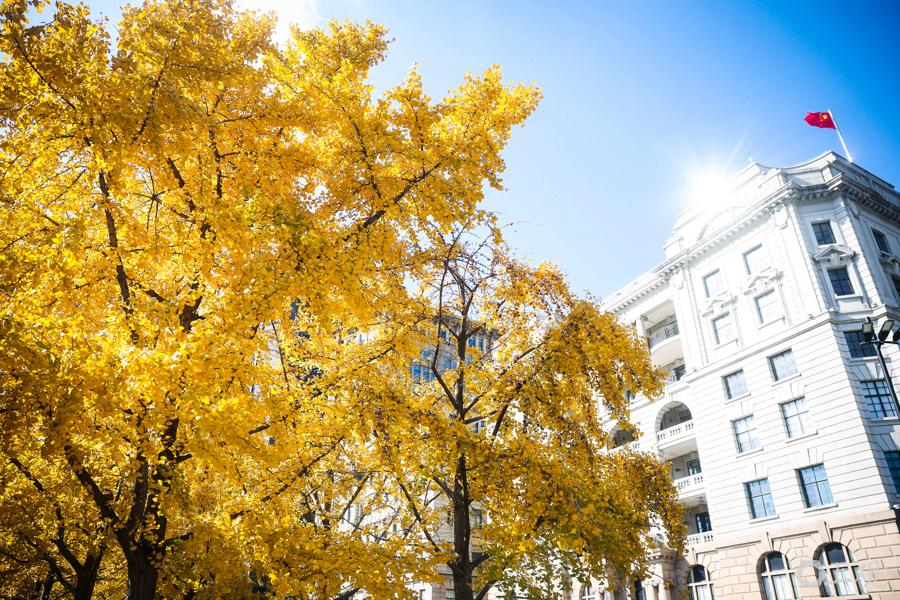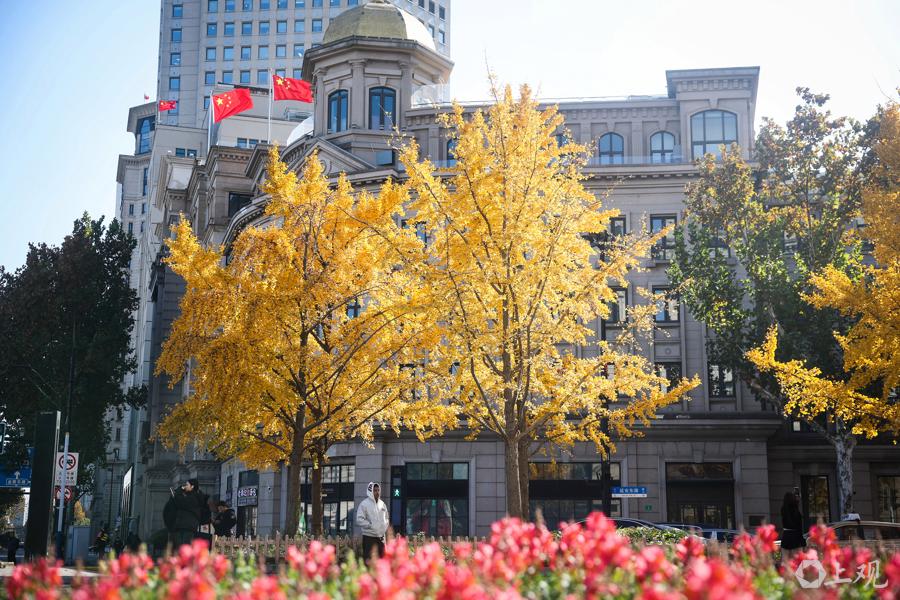 12月3日,上海晴空万里,中山东一路与延安东路路口银杏尽染金黄,叶影斑驳铺地。