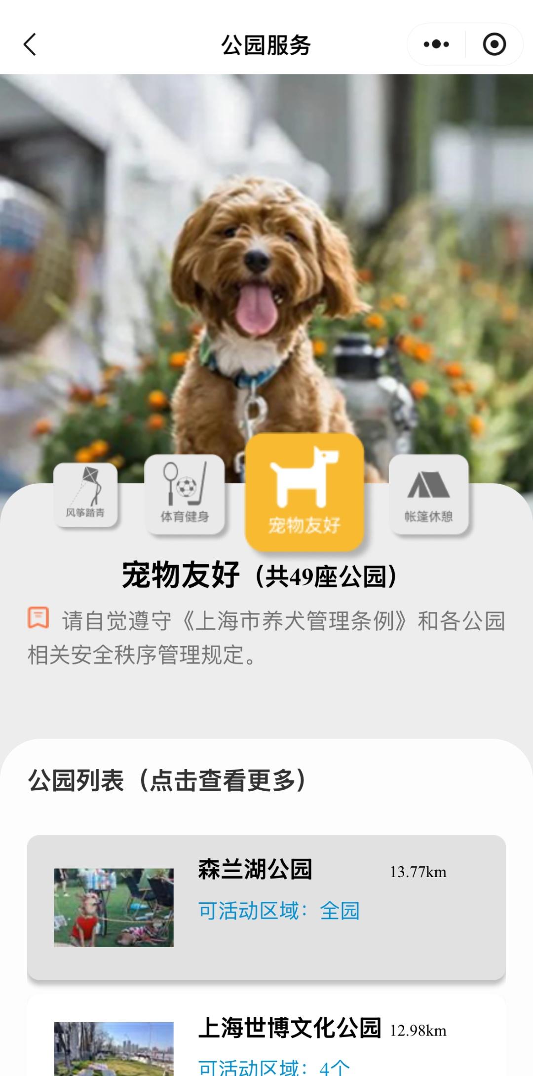 服务还按功能对公园进行划分,大家还可以根据游玩需求,选择具有「宠物友好」、「帐篷休憩」、「风筝踏青」、「体育健身」等功能的公园,即可一键查询全市符合条件的公园信息。