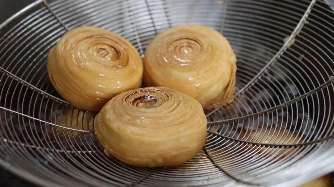 在寿县古城,一定要寻找这种千年名点:金黄酥脆的圆形糕点,外皮有数道层层叠起的花酥,饼心如急流旋涡状,内放馅料,吃起来外皮酥松,馅味香甜。