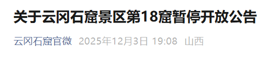 公告还表示,第18窟的具体恢复开放时间将通过云冈研究院官网和“云冈石窟官微”、“云冈石窟文旅”公众号等另行通知。