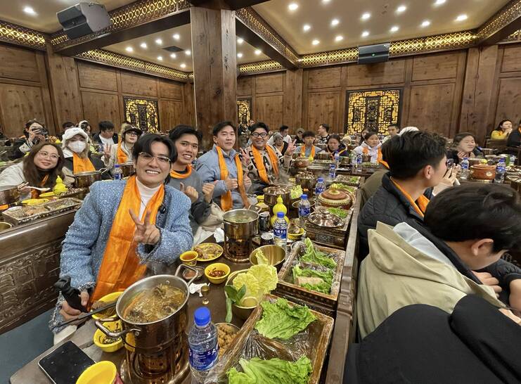 傍晚时分,博主们走进当地一家颇具特色的藏族餐厅,体验香格里拉独具特色的歌舞伴餐“土司宴”。酥油茶、糌粑、牦牛肉火锅、青稞饼……一道道传统藏餐被端上桌。博主黎日观在品尝牦牛肉火锅时赞叹:“肉质鲜美,搭配特制的蘸水,味道很好!”大家一边品尝美食,一边欣赏精彩的弦子舞、锅庄舞等歌舞表演,博主们在轻松愉悦的氛围中感受着香格里拉的民族风情和独特魅力。