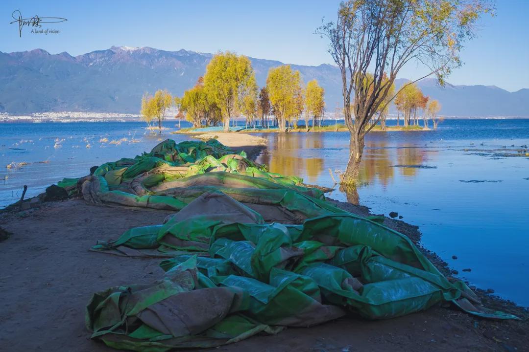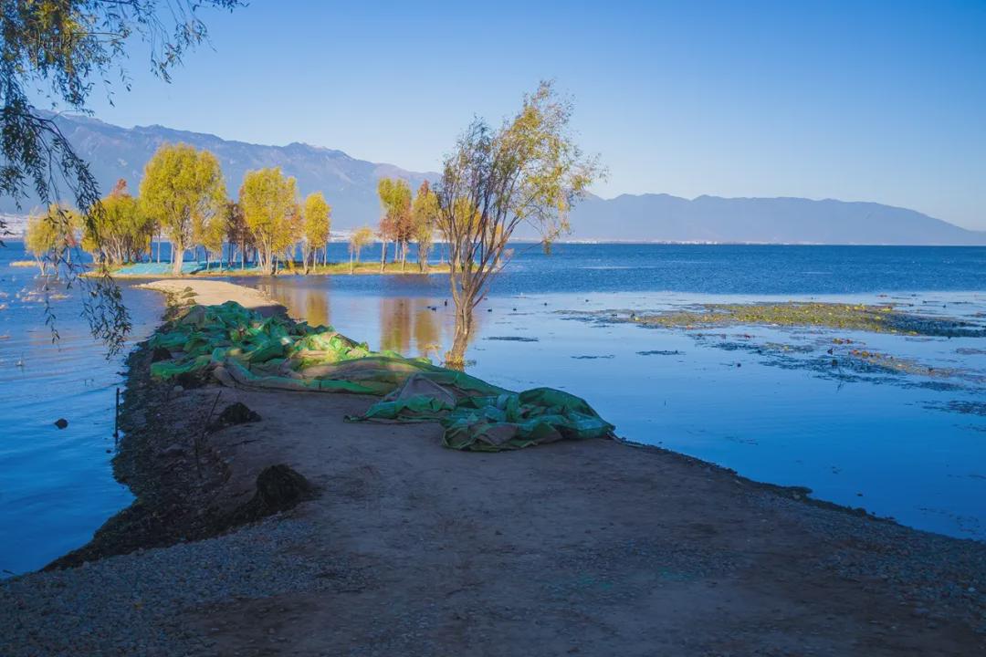 这条土坝直入洱海近百米,中间目前被一堆绿色障碍物阻挡着,如果想走到尽头,需要小心翼翼地寻找落足点才行,但总的来说难度不大。