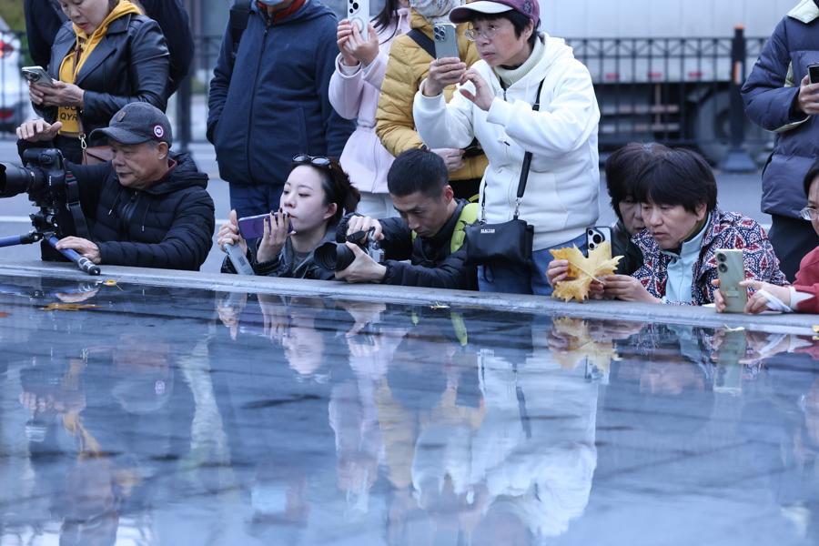 现场吸引大量游客前来观景拍照。既有举着自拍杆记录美景的年轻人,也有架着三脚架捕捉光影的摄影爱好者,身着汉服的游客穿梭其间,与秋景古刹构成一幅灵动的画面。