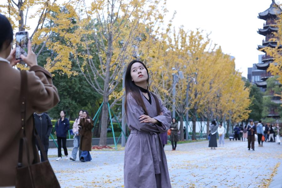 寺内三圣宝殿前的千年银杏更具韵味,粗壮枝干上的叶片黄得格外通透,与古刹的飞檐翘角、红墙黛瓦相映成趣,禅意与秋意在此完美交融。塔前水池则成为网红拍摄点,水面如镜,将金黄叶片、古朴塔影与蓝天融为一体,形成绝美的对称画卷,不少游客在此排队打卡,定格这份诗意。