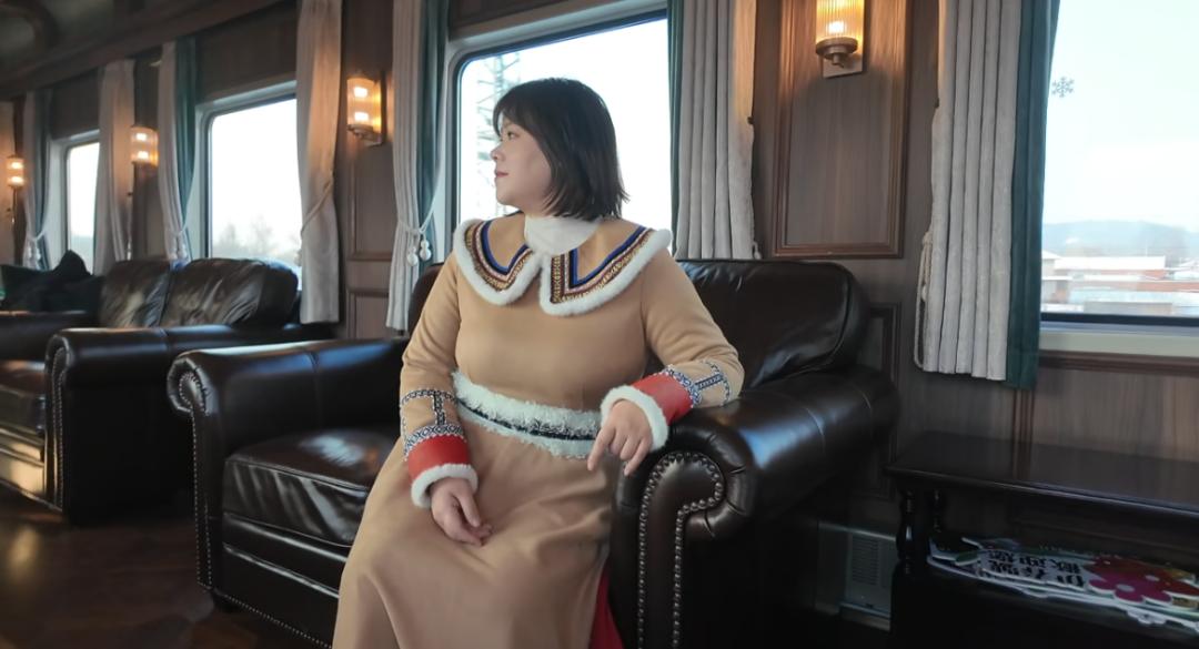 游客身穿鄂伦春服饰在车厢内拍照