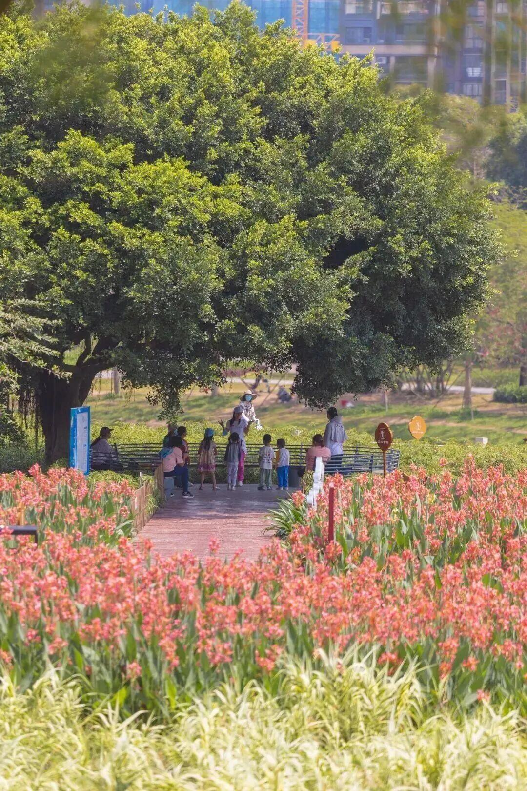 观澜河湿地公园里还有超大片的粉红水生美人蕉,以及种植在观澜河河畔旁的一片白色的“海洋”。这种宛如白色羽毛的花叶芦荻在深圳十分少见,且异常美丽。难怪网友安利,先拍花、后逛园,不枉一个多小时来一趟。
