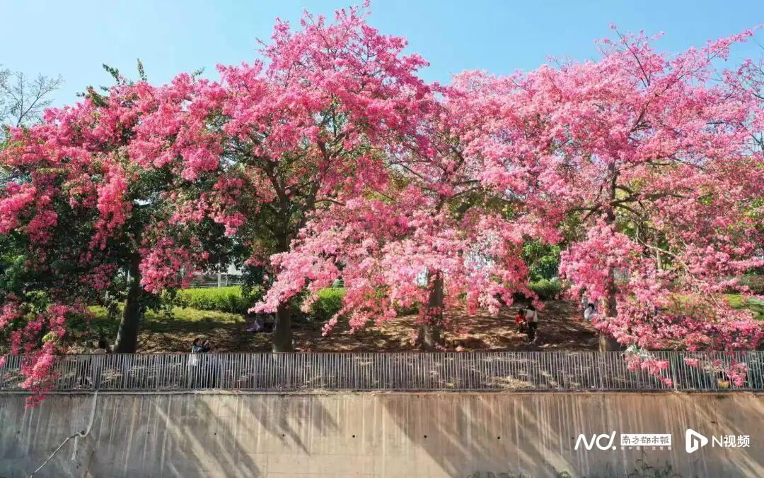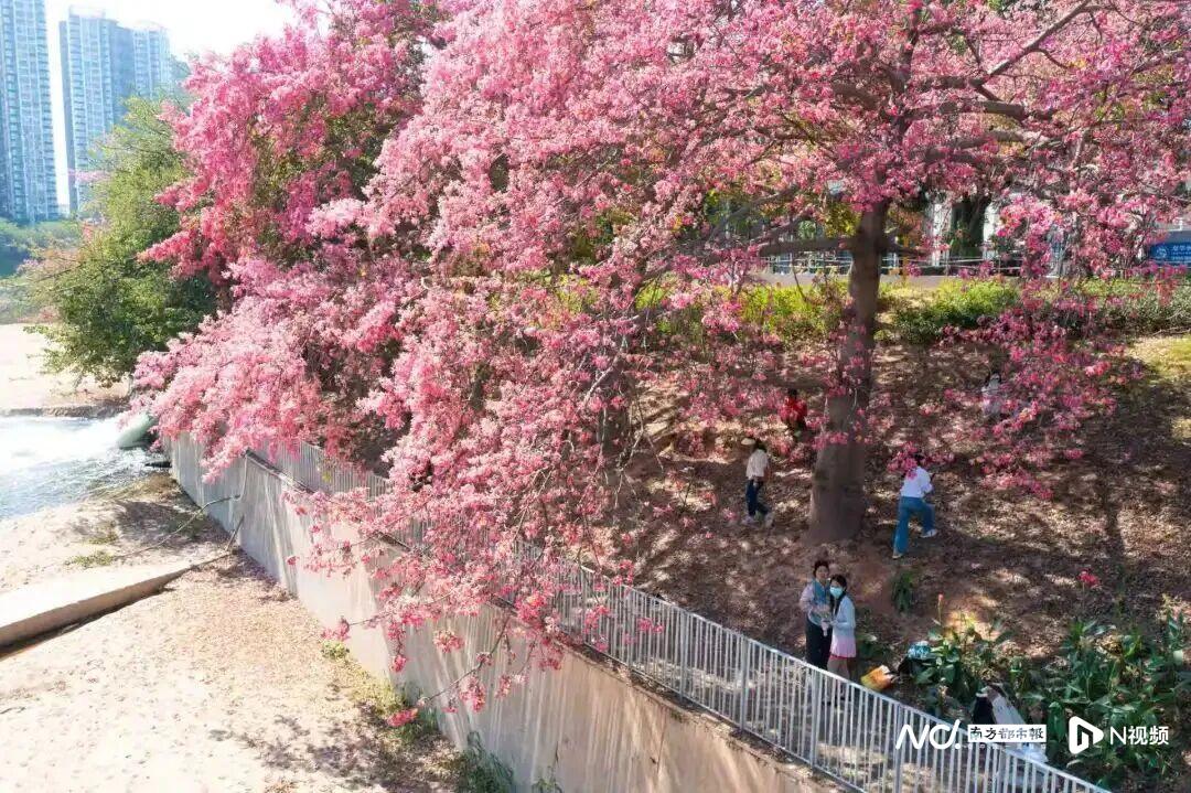 龙华区城管局向记者介绍,美丽异木棉原产美洲,还有个昵称叫“美人树”,它虽非本地原生树种,却早已在龙华扎根绽放,其赏花期为9月至次年1月,10月至12月为最佳观赏期,盛花时繁花遮叶,宛如枝头浮起的柔美云霞,观澜河沿岸、永顺街、望辉路等路段的异木棉近期都在同步绽放。