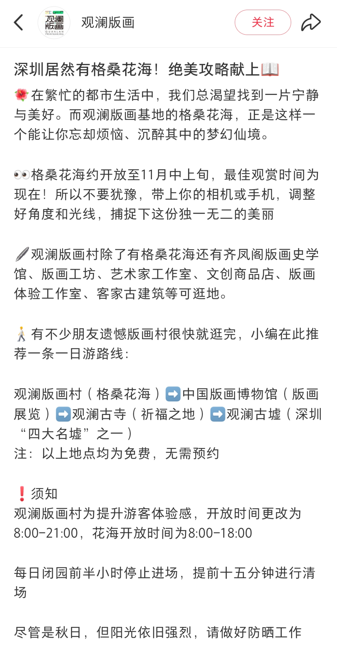 要是遇上“壹田创意”的小店营业,一定要带上手账本去盖免费的格桑花印章。赏完花别着急走!中国版画博物馆、观澜版画村古建筑就在附近,可以顺路一起打卡。