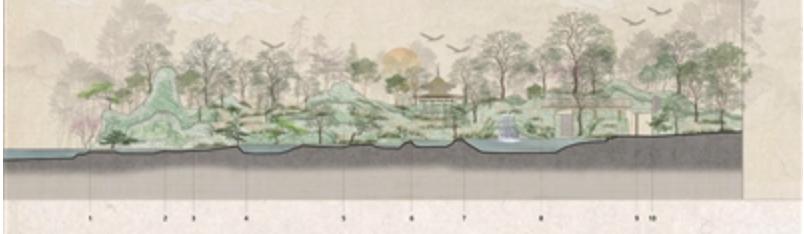 园林的竖向设计展现了匠心独运的技艺。通过塑石假山技艺,园内山体基本高度控制在3—5米,局部达到8米,并借助精妙的视点设计,营造丰富的视觉层次,有限的空间内可以创造出真山真水的磅礴气势。“我们借鉴了中国山水画的‘透视’与‘遮隔’手法。”王旭达解释道,“通过山体的转折、植物的掩映,遮蔽了山的全貌,延长了游客的视觉流程和心理距离。届时游客行走其间,不会觉得狭小,反而能感受到山势连绵,有探不尽的幽深,具有自然山水宋画的意境。”这一设计理念在绍兴园的“千里江山图”中达到极致,设计团队从宋代名画《千里江山图》中汲取灵感,结合绍兴东湖、羊山石城的残山剩水特色,将石宕、清流、草木浓缩于一园,在方寸之间铺陈开一幅气象万千的江山画卷。