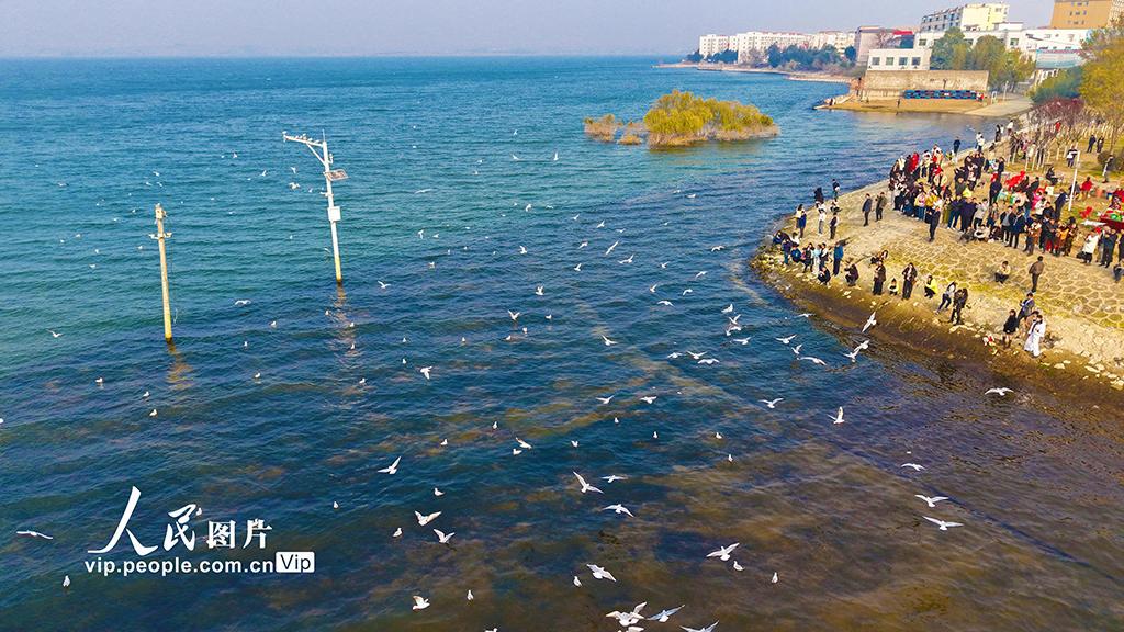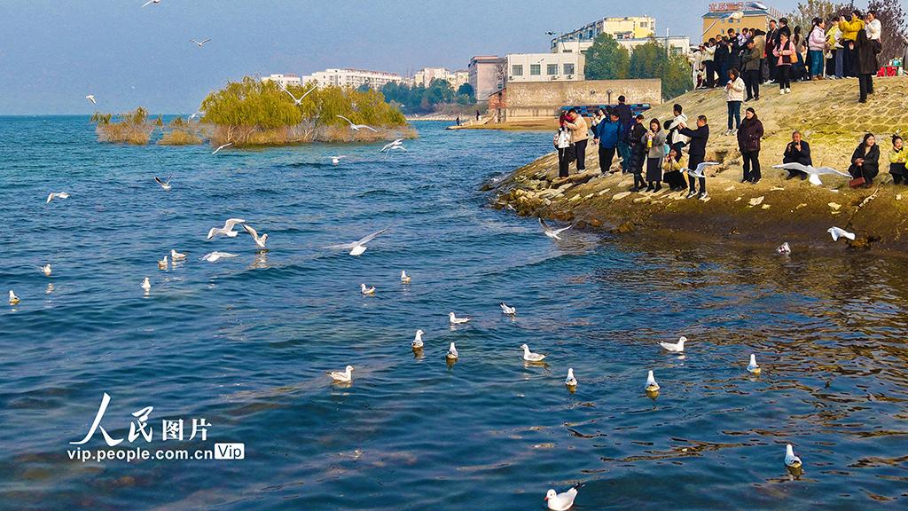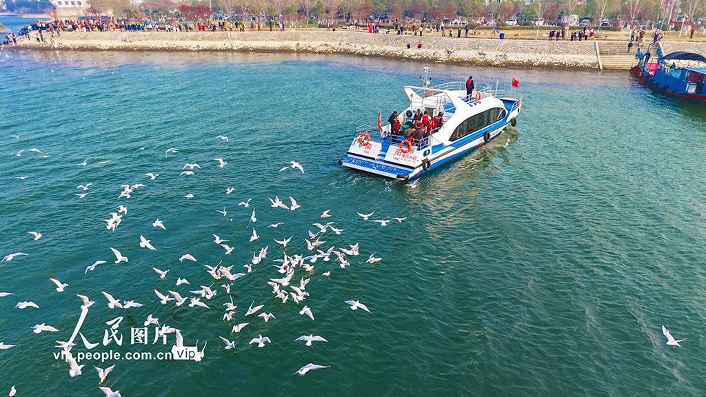 2025年12月11日,河南省南阳市淅川县丹江口水库宋岗码头,成群红嘴鸥时而掠过水面觅食,时而振翅飞翔,吸引众多游客。
