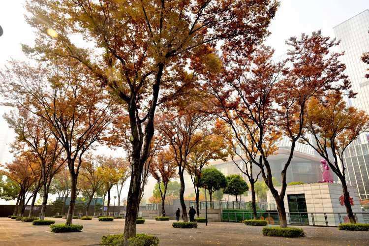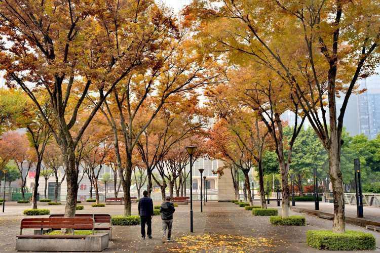 步入江北嘴中央公园,成片红榉木构成了冬日里最热烈的风景线。曾经的翠绿叶片逐渐褪去青涩,晕染出从橘红到火红的渐变色彩,宛如晚霞栖落林间。阳光穿透枝叶,在地面投下斑驳光影,漫步其中仿佛置身于天然画廊。