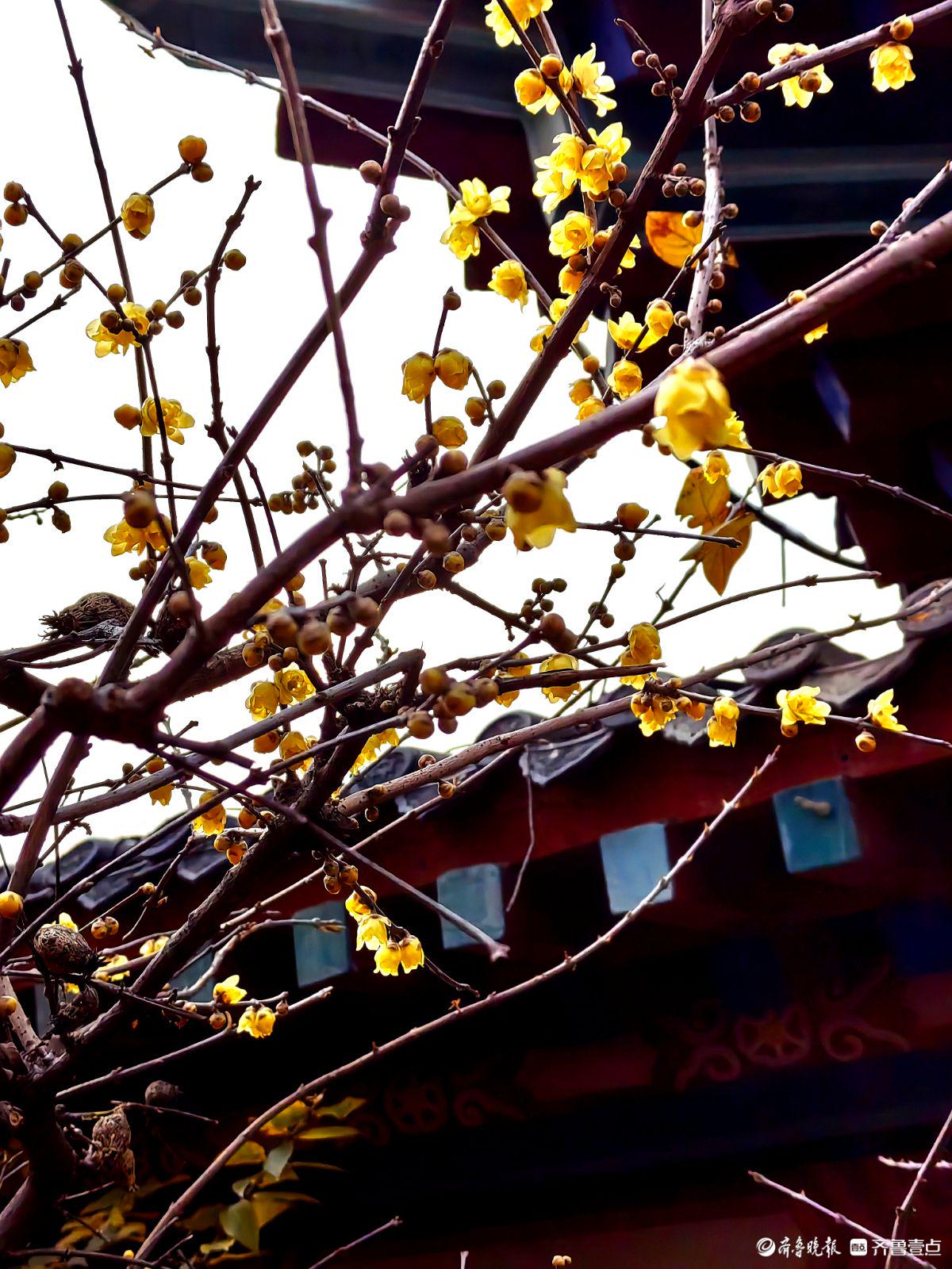 近日,济南大明湖尚泉尚水茶社院内的腊梅花开了。苍劲的老枝虬曲如铁,却缀满了嫩黄的花苞,有的半绽如铃,有的怒放似盏,金黄的花瓣凝着清冽的香,在料峭寒风里悠悠飘散。 王平 摄