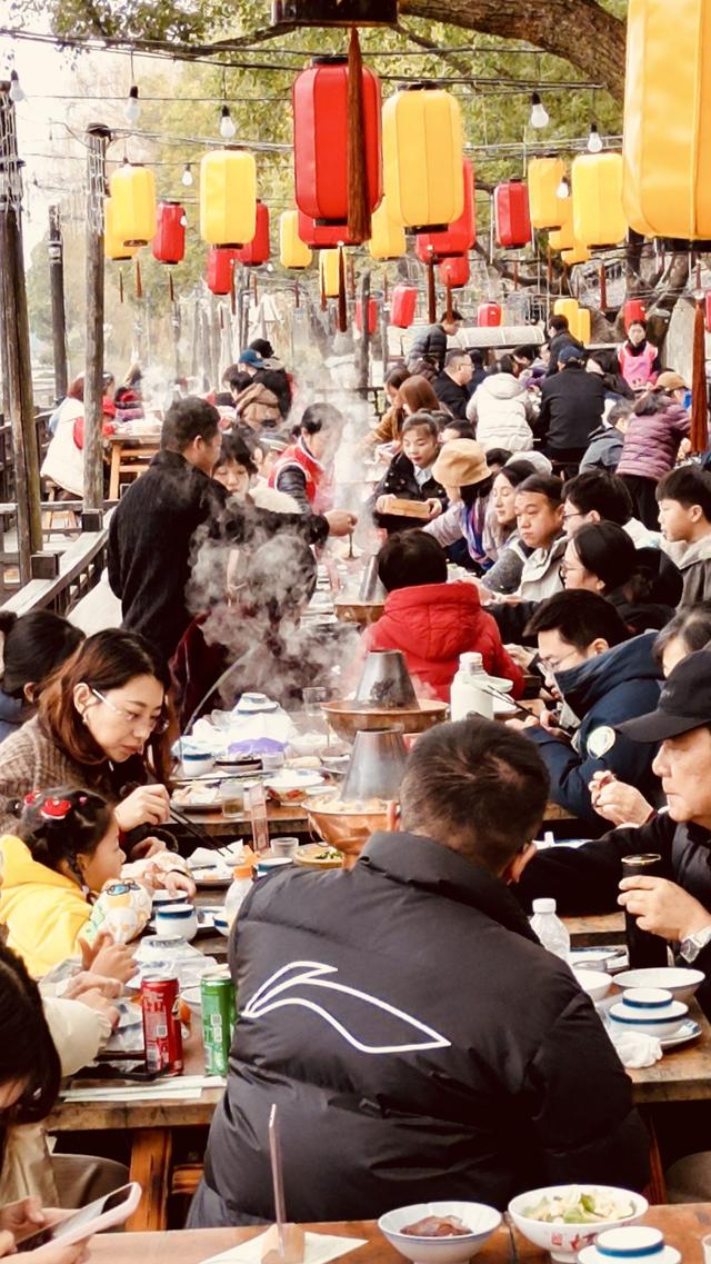 贝壳财经记者在现场看到,数十张木桌连成一片,游客们围坐其中,品尝着“全家福暖锅”,耳边是新春鼓乐齐鸣,眼前是摇橹船缓缓驶过。