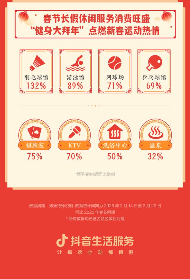 2月14日至2月22日,在“团圆欢聚”与“文旅过年”双重热潮带动下,餐饮堂食、旅游住宿、非遗体验、休闲娱乐等多品类消费迎来显著增长。